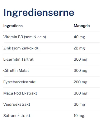 Disse ingredienser er udvalgt for deres komplementære effekter på både krop og sind. Zink og Maca fremmer en sund testosteronbalance, mens Citrullin og L-Carnitin giver øget udholdenhed og hurtigere restitution. Vitamin B3 reducerer træthed, og Safran hjælper med at bevare en stabil og positiv sindstilstand. Kombinationen gør TestoLink til et effektivt supplement for mænd, der vil bevare energi og selvtillid i en travl hverdag.