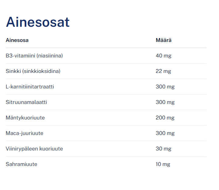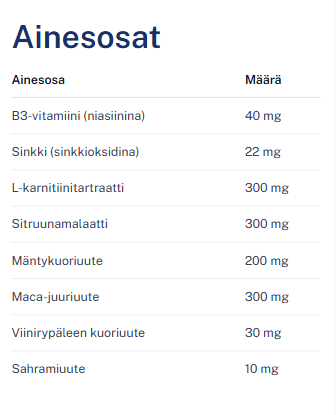 Nämä ainesosat on valittu niiden toisiaan täydentävien vaikutusten vuoksi sekä kehoon että mieleen. Sinkki ja maca edistävät tervettä testosteronitasapainoa, kun taas sitrulliini ja L-karnitiini tukevat parempaa kestävyyttä ja nopeampaa palautumista. B3-vitamiini auttaa vähentämään väsymystä ja sahrami tukee tasapainoista ja positiivista mielentilaa. Tämä yhdistelmä tekee TestoLink tehokkaan ravintolisän miehille, jotka haluavat säilyttää energian ja itsevarmuuden kiireisessä arjessa.