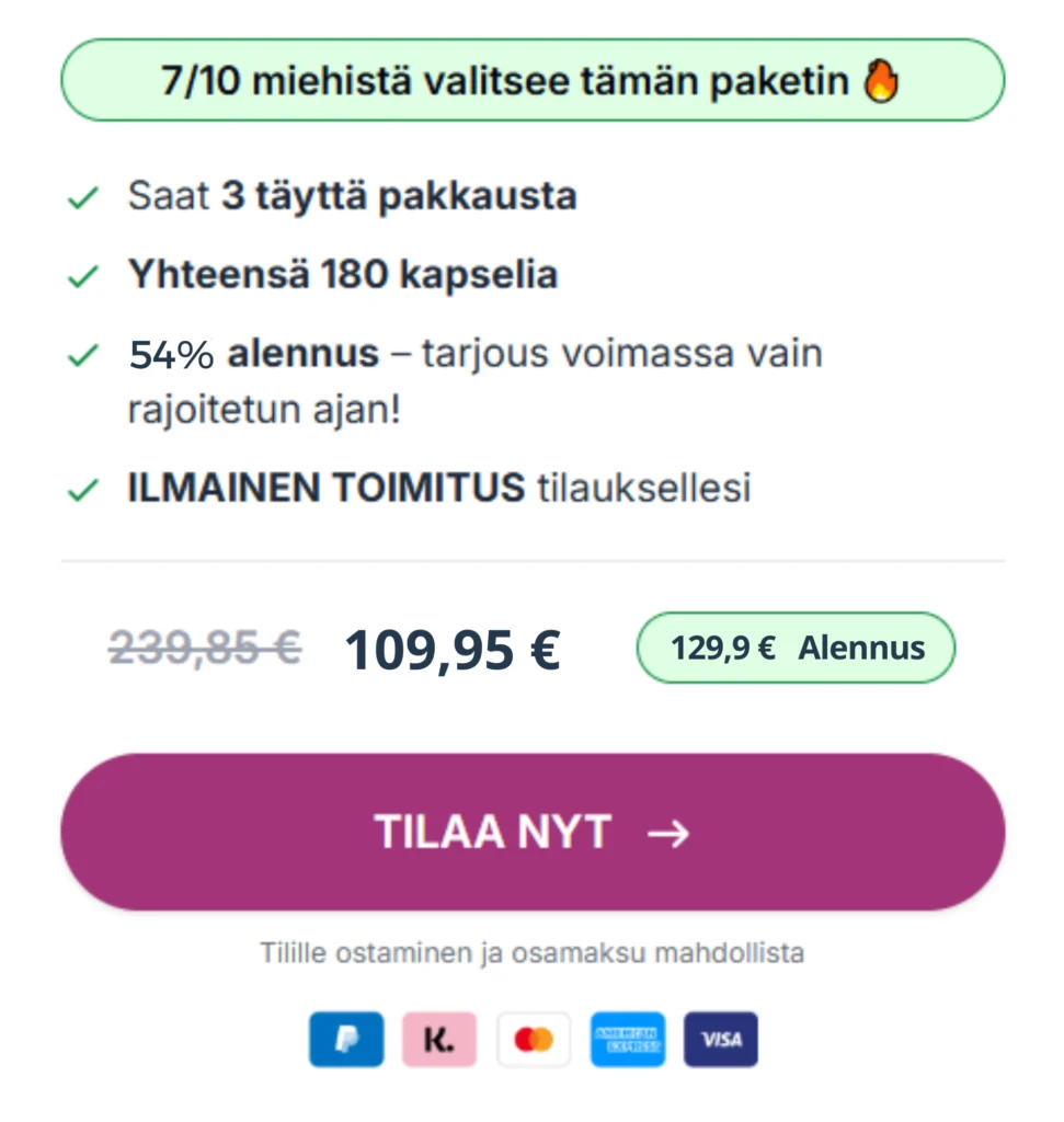 “Hyvä tuote, jossa on luonnollisia ainesosia. Vaikutukset tulivat vähitellen, mutta ovat selvästi havaittavissa kahden kuukauden jälkeen. Enemmän energiaa, parempi uni ja yleisesti parempi hyvinvointi. Aion jatkaa tuotteen käyttöä.”