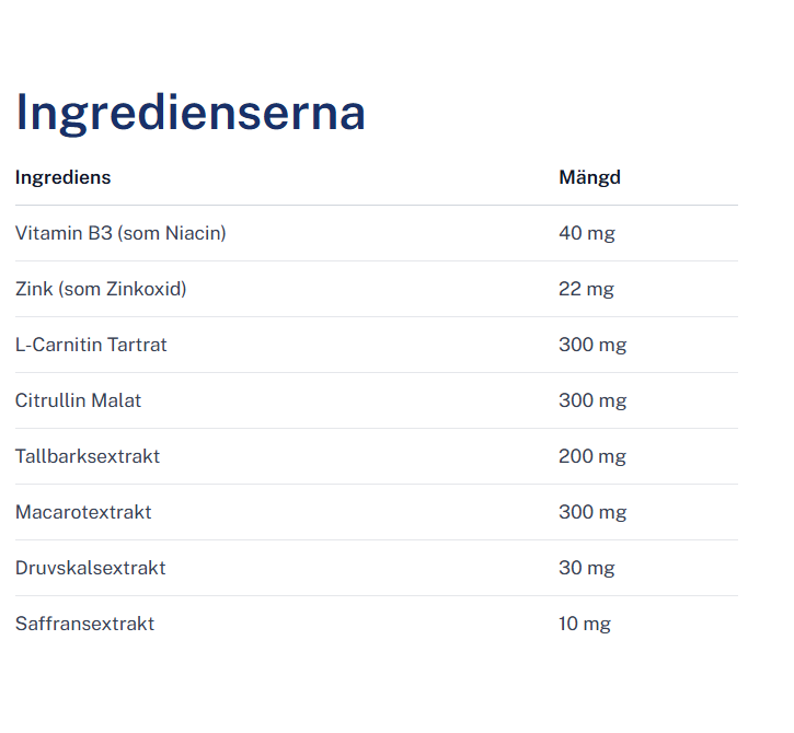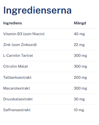Dessa ingredienser har valts för sina kompletterande effekter på både kropp och sinne. Zink och Maca främjar en hälsosam testosteronbalans, medan Citrullin och L-karnitin ger ökad uthållighet och snabbare återhämtning. Vitamin B3 minskar trötthet och saffran hjälper till att bevara ett stabilt och positivt sinnestillstånd. Kombinationen gör TestoLink till ett effektivt kosttillskott för män som vill behålla energi och självförtroende i en hektisk vardag.